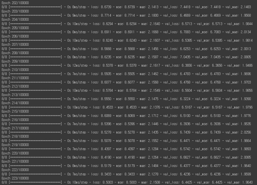 monitor 파라미터에는 감시할 평가 데이터를 대입하고 patience에는 몇번 동안 개선이 없으면 학습을 중단할 건지 대입한다. 이걸 fit의 callbacks에 배열로 대입하면 된다.epochs에 십만을 대입했지만 실제로는 200번대 에서 중단했다.