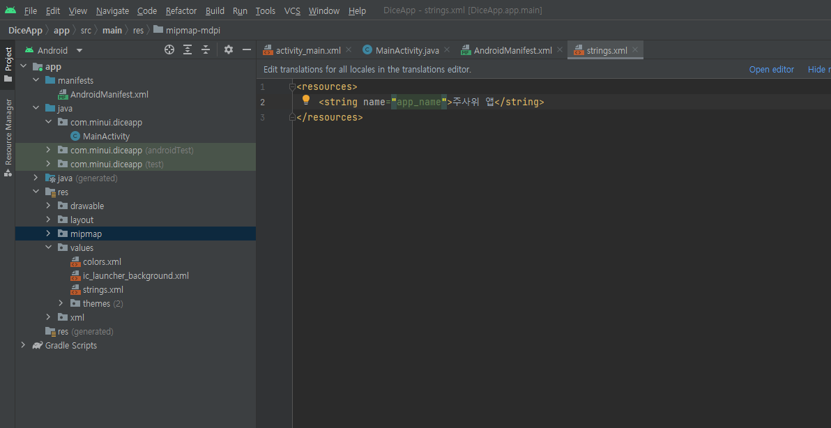 그러면 string.xml 파일로 넘어가는데 원하는 이름을 적어주면 된다.