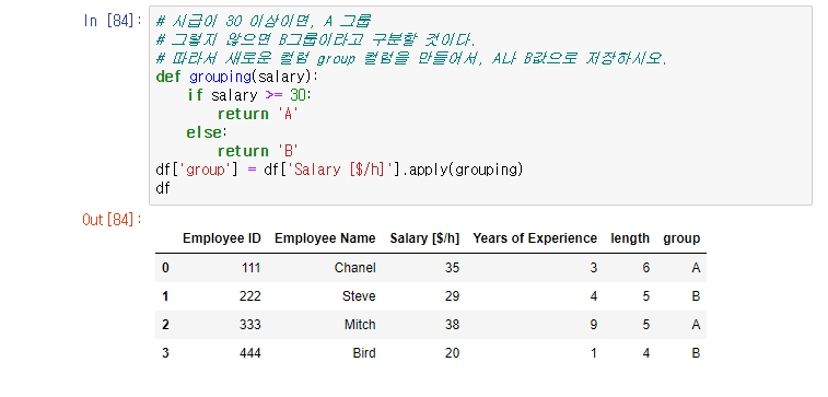 시급이 30이상이면 A그룹 그렇지 않으면 B그룹으로 구분한 group column을 만들고 싶다.