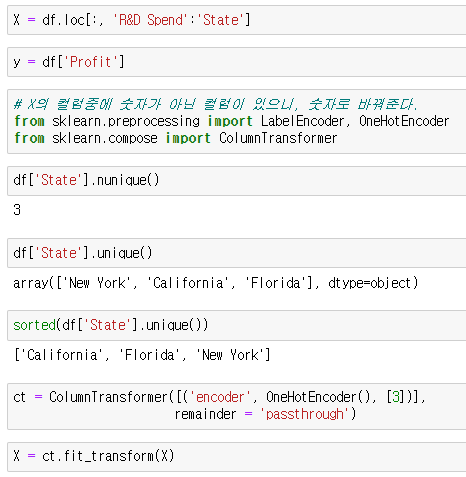 X와 y를 설정하고 카테고리컬 문자열 데이터 fit_transform을 통해 원핫인코딩을 해준다.