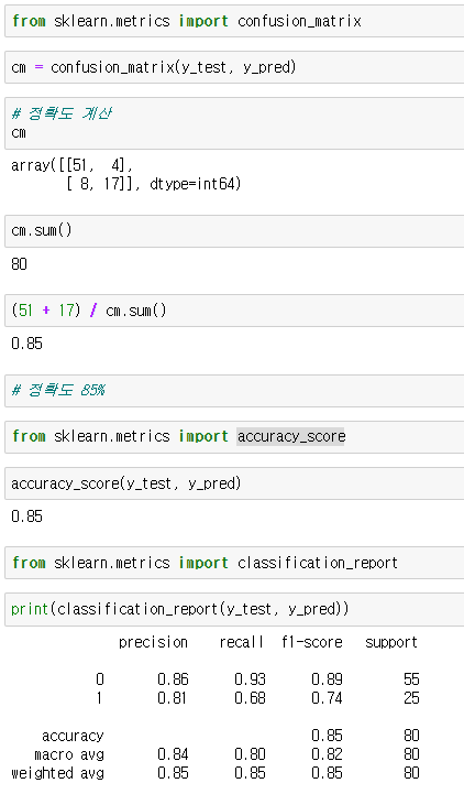 accuracy_score(y_test, y_pred)로 정확도를 구하고 classification_report(y_test, y_pred)로 위의 표처럼 출력한다.