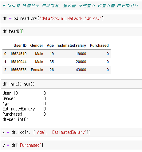 나이와 연봉으로 분석해서, 물건을 구매할지 안할지를 분류하자!!