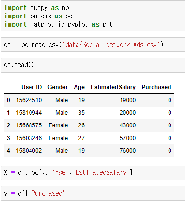 라이브러리와 데이터를 불러오고, X와 y에 알맞게 대입한다.