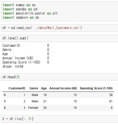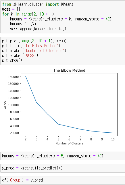 적절한 k 값(몇 개 그룹)을 찾기 위해서는 . WCSS값을 확인해야 한다! 따라서 K를 2부터 10까지 다 수행해 보고나서