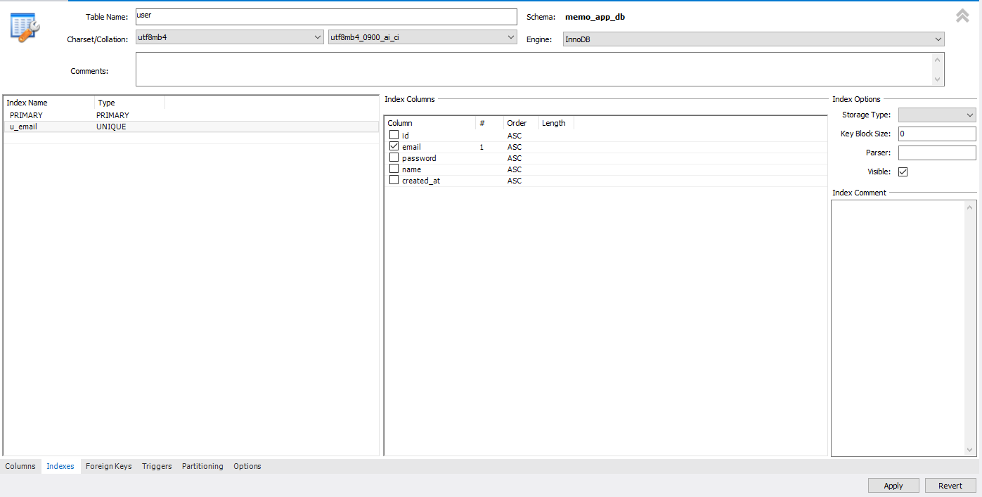 두 번째 방법은 indexes에 들어가서 Index Name에 이름을 넣고 Type에 UNIQUE를 설정후 Index Columns에 원하는 컬럼을 선택하고 apply하는 것이다.