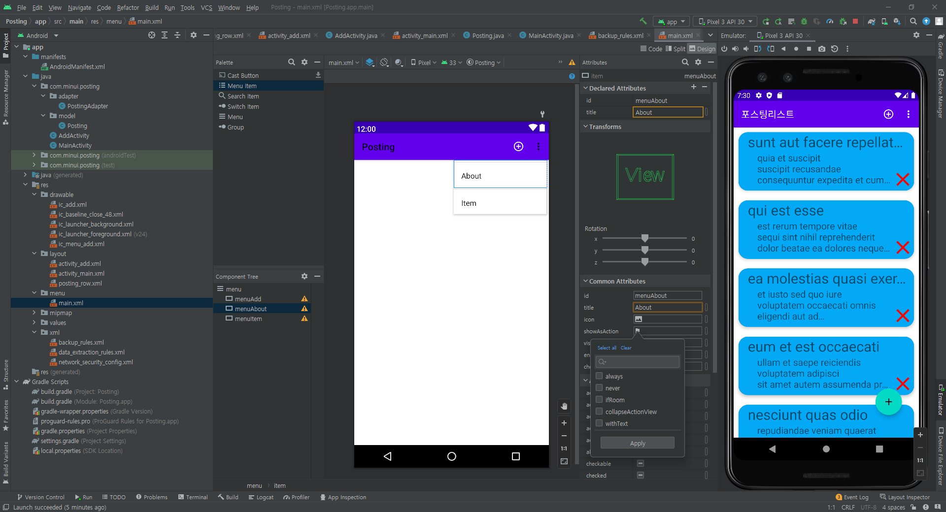 원하는 ui배치하고 id와 title을 정해준다.icon과 showAsAction도 정해준다.