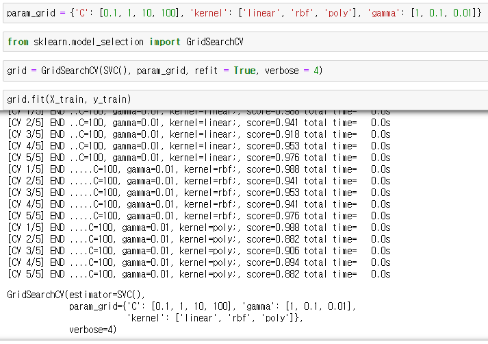 param_grid 라는 변수에 딕셔너리로 파라미터 경우의 수를 대입하고 GridSearchCV모델을 만든다.