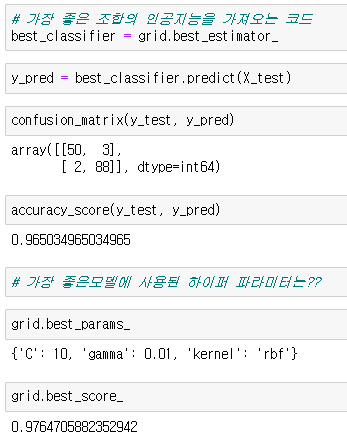 GridSearchCV.best_estimator_로 가장 좋은 조합을 가져오고 GridSearchCV.best_params_로 가장 좋은 모델에 사용된 하이퍼 파라미터를 가져온다.