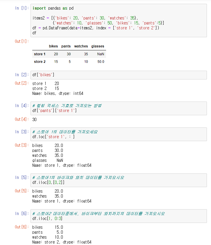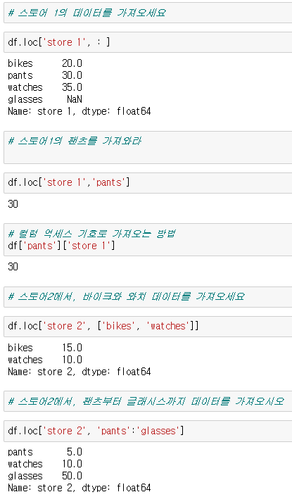 시리즈 변수에 []기호 안에 숫자 인덱스나, 정해놓은 인덱스를 넣으면 되고, 두개이상 쓸때는 배열로 넣는다.
