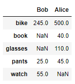 items = {'Bob' : pd.Series(data = [245, 25, 55], index = ['bike', 'pants', 'watch']),