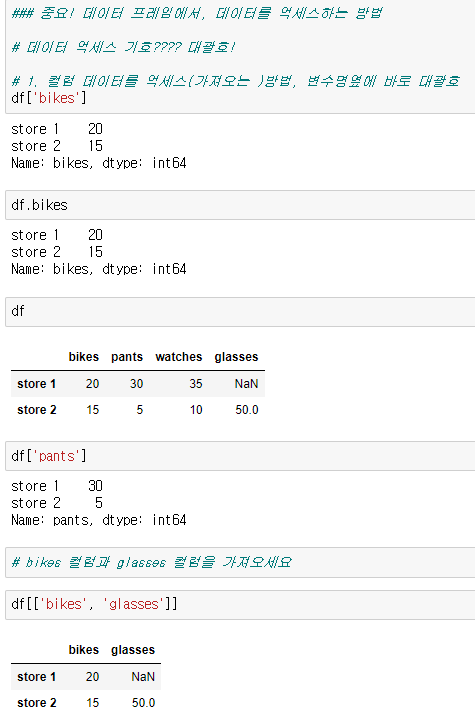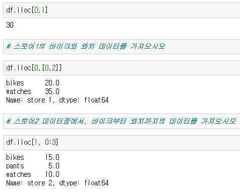 시리즈 변수에 []기호 안에 숫자 인덱스나, 정해놓은 인덱스를 넣으면 되고, 두개이상 쓸때는 배열로 넣는다.
