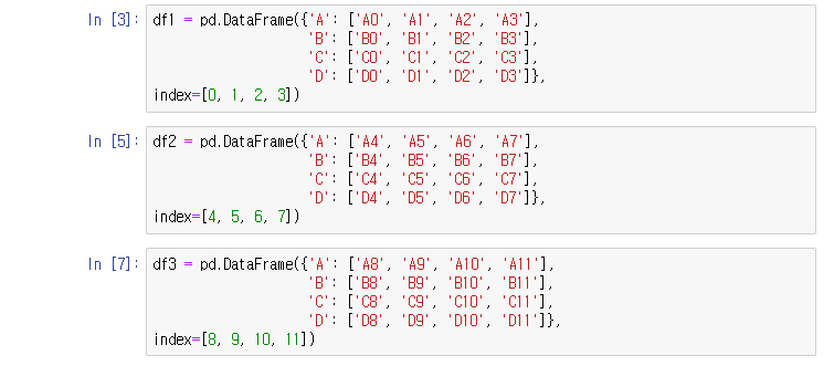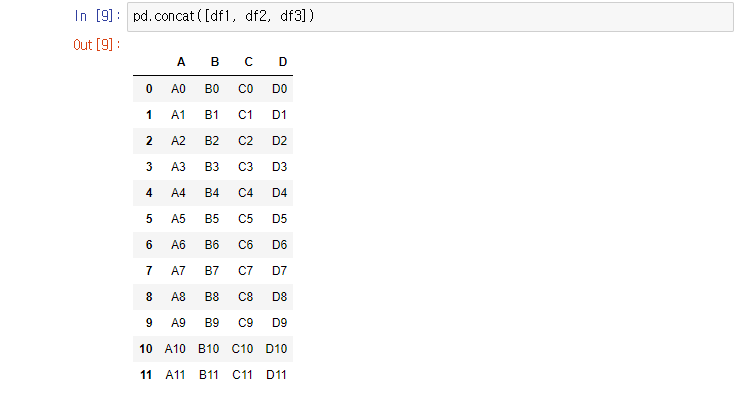 pd.concat()함수는 데이터프레임을 말그대로 물리적으로 이어 붙여주는 함수다.