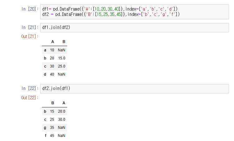 pd.join() 함수를이용한 데이터프레임 합치기다. pd.join()은 인덱스를 기준으로 왼쪽으로 순차적으로 연결되는 방식이다. 어떤 인덱스를 기준으로 하느냐에 따라 배열이 달라진다.