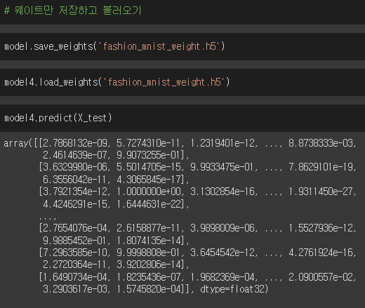 모델의 웨이트만 저장하고 불러온뒤 빈 모델에다 웨이트를 불러오고 예측을 시행한다.