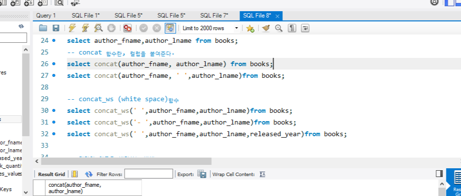 두개 이상의 column을 합치고 싶은 경우 concat이나 concat_ws를 쓴다. concat_ws는 맨 처음에 구분자가 들어간다.