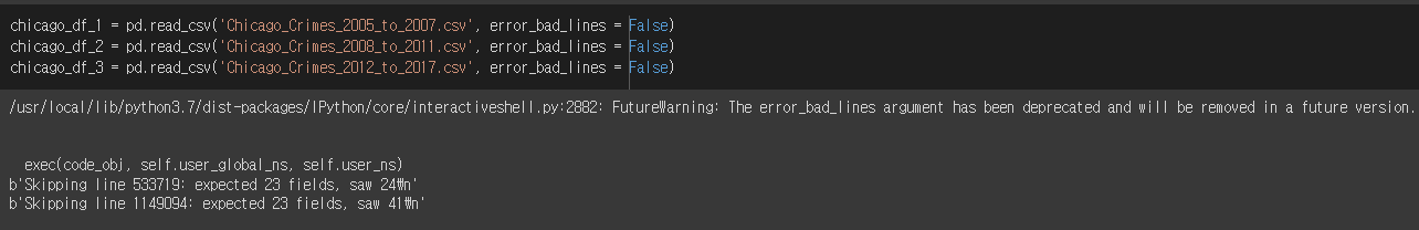 이 때 error_bad_lines = False 파라미터를 사용하면 위 사진처럼 문제가 있는 line을 건너뛰고 읽어온다.