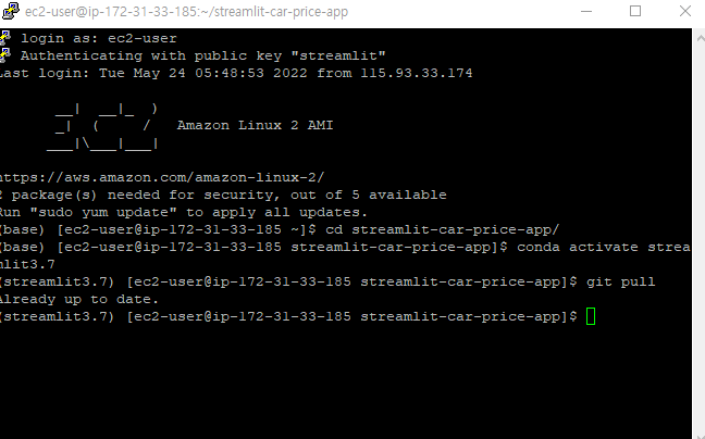 putty로 ec2에 접속후 로그인하고 경로 설정한 뒤 가상환경을 활성화 시킨다.