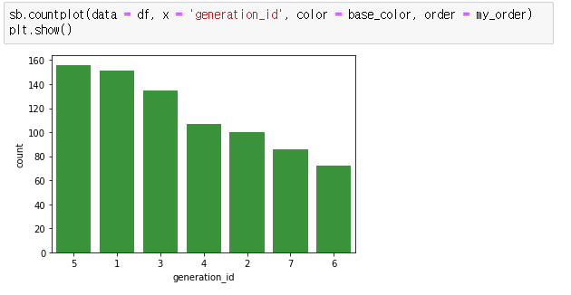 sb.color_palette()를 통해 색을 지정하고 value_counts().index로 내림차순 인덱스를 얻어서 x에 원하는 column을 대입했다.