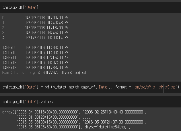 Date column에는 날짜문자열이 들어 있었는데 이것을 pd.to_datetime함수를 통해 datetime64로 변경한다.